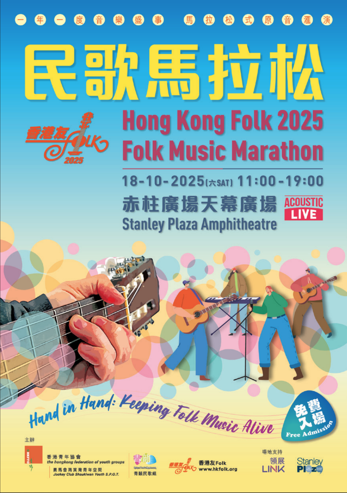 A folk concert in “Folk Marathon” format, co-organized by the HK Folk Club, held as part of the Tsuen Wan Arts Festival. Songs performed:1. Wasted On The Way 2. What A Wonderful World 3. Too Young To Be Married 4. Suite Judy Blue Eyes